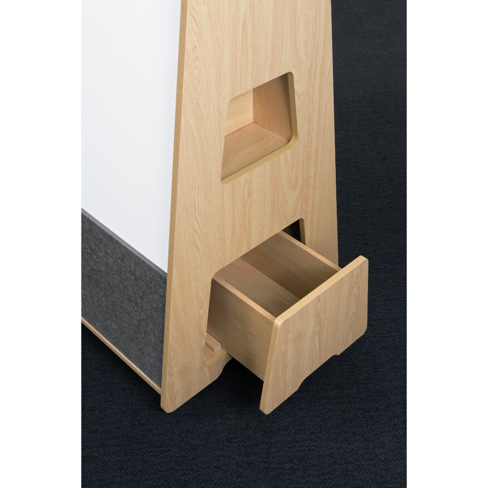 A-frame design in a wood finish. Offering two large writing surfaces and a magnetic receptive acoustic pinboard base. Store away tools and accessories in the side drawers and storage cubby holes. Double-sided magnetic whiteboard surface. Lockable castor wheels for mobility and stability. Flipchart hooks for added functionality. Perfect for classrooms, offices and studios. Overall size:? 1000W x 700D x 1820mmH. Acoustic Panel Pinboards x 2: 940W x 18D x 335mmH. 8 Year Manufacturer's Warranty. Delivery, installation and assembly charges may apply to furniture. Please enquire to confirm.
